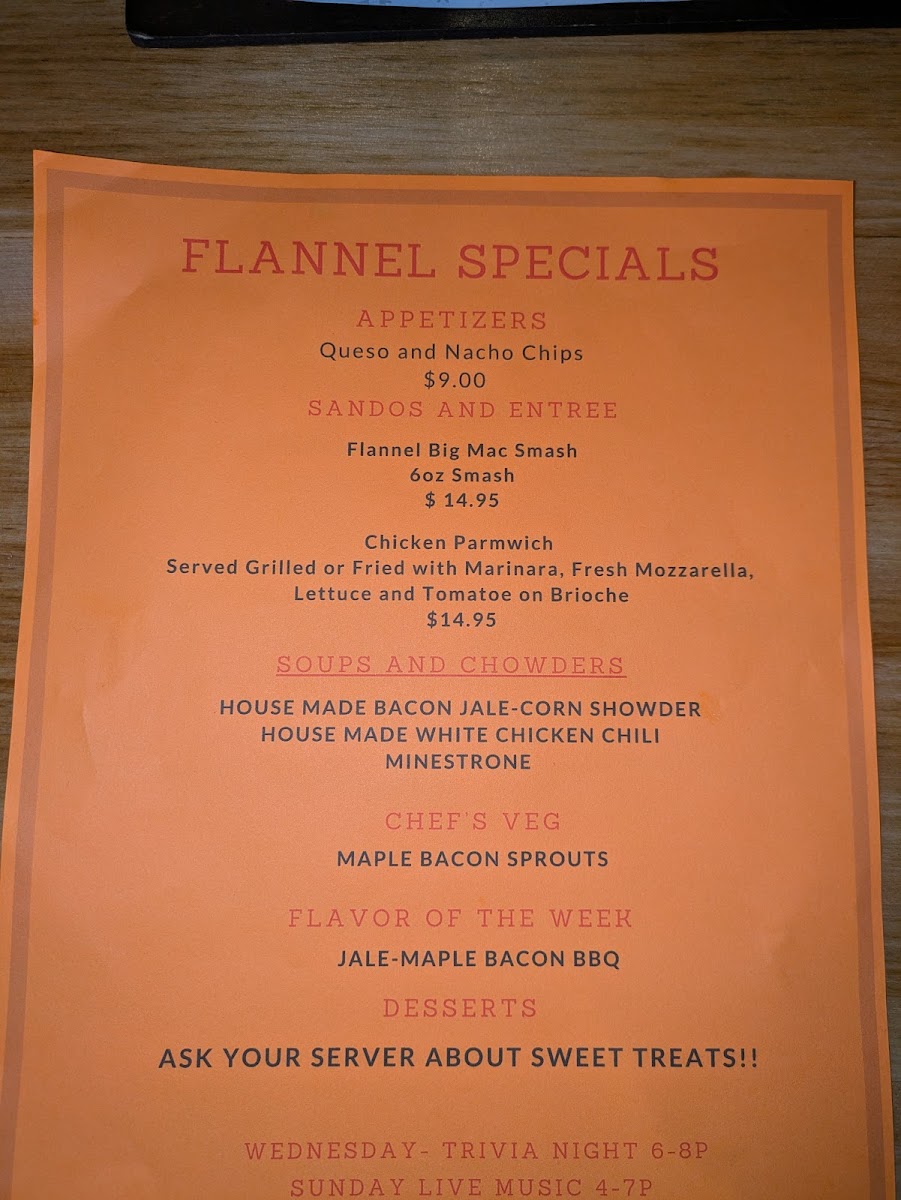 The atmosphere is friendly and welcoming, reflecting the charm of a small, locally-owned business. Customers appreciate the attentive service, even during busy times. Whether you're stopping by for a casual lunch or a family dinner, Flannel Tavern promises a satisfying experience that will keep you coming back for more.